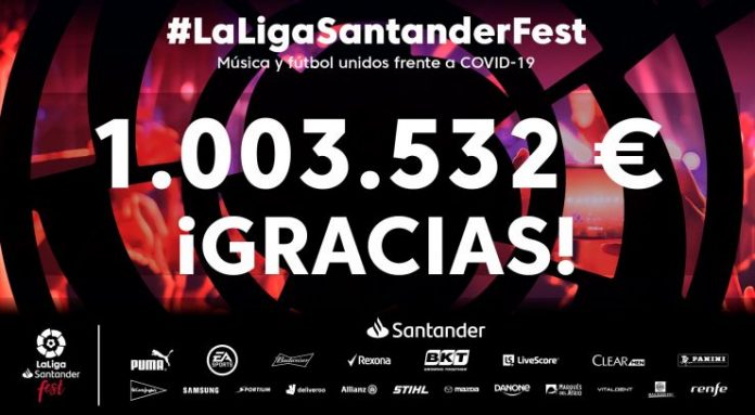 El concierto ‘LaLigaSantander Fest’, organizado el pasado sábado por LaLiga, Banco Santander, Universal Music y GTS en colaboración con el resto de los patrocinadores de LaLiga, logró recaudar el pasado sábado 1.003.532 euros en un evento que reunió a numerosos artistas y deportistas que decidieron aportar su granito de arena en la lucha contra el coronavirus.