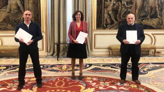 El contencioso abierto entre la Real Federación Española de Fútbol y LaLiga de cara al retorno del fútbol profesional parece en vías de resolución tras el encuentro de más de ocho horas que tuvo lugar el pasado sábado en el Palacio de Viana (Ministerio de Asuntos Exteriores, UE y Cooperación) y en el que estuvieron presentes la presidenta del Consejo Superior de Deportes (CSD), Irene Lozano; el presidente de LaLiga, Javier Tebas; y el presidente de la RFEF, Luis Rubiales.