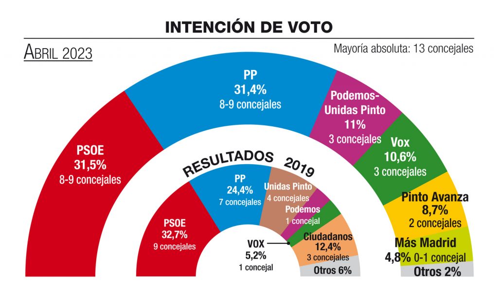Tablas mexicanas en Pinto. Empate técnico entre los bloques de izquierda y derecha tras las elecciones municipales del 28 de mayo. Esa es la lectura de la encuentra elaborada por Sigma Dos para Al Cabo de la Calle merced a 502 entrevistas, realizadas del 14 al 20 de abril.