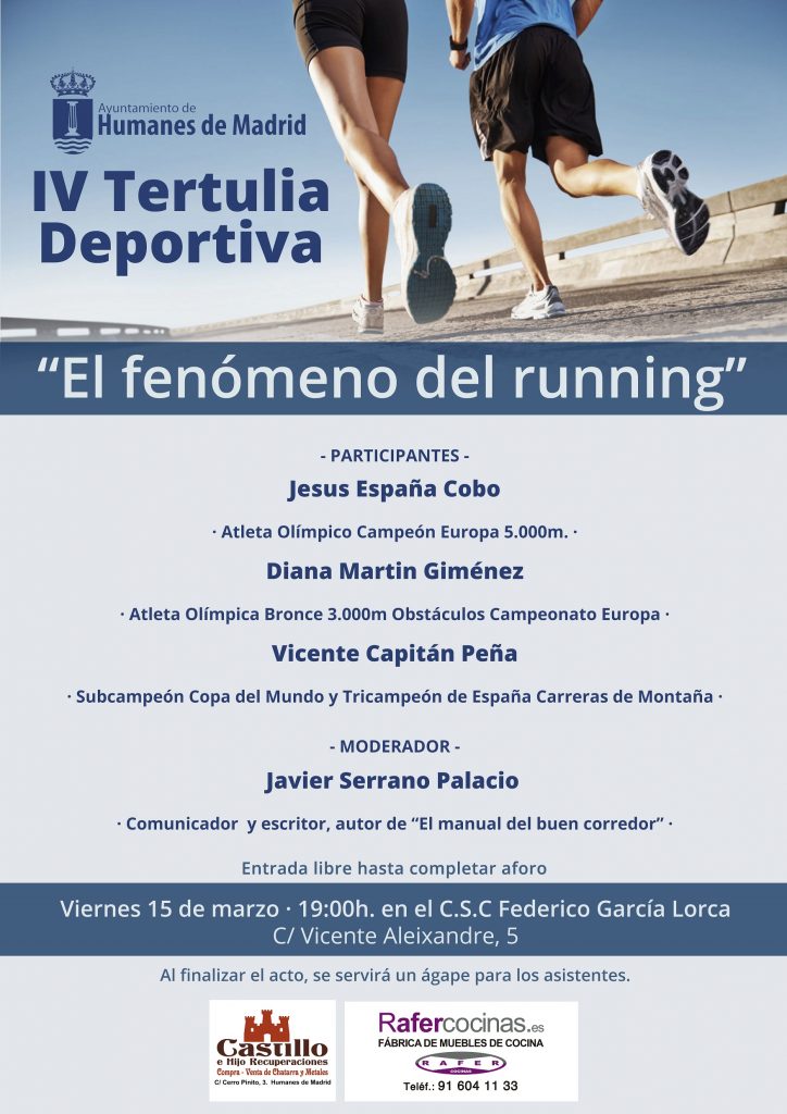 La Tertulia Deportiva de Humanes alcanzará este viernes su cuarta edición con una importante novedad, ya que por vez primera el coloquio no versará acerca del fútbol. En esta ocasión tratará acerca de ‘El fenómeno del running’, un deporte que se ha puesto de moda en los últimos tiempos y que en Humanes cuenta con una amplísima legión de adeptos, por lo que se espera una gran afluencia de público a las 19.00 horas en el centro sociocultural Federico García Lorca, máxime teniendo en cuenta que la entrada es libre y gratuita hasta completar el aforo del recinto.