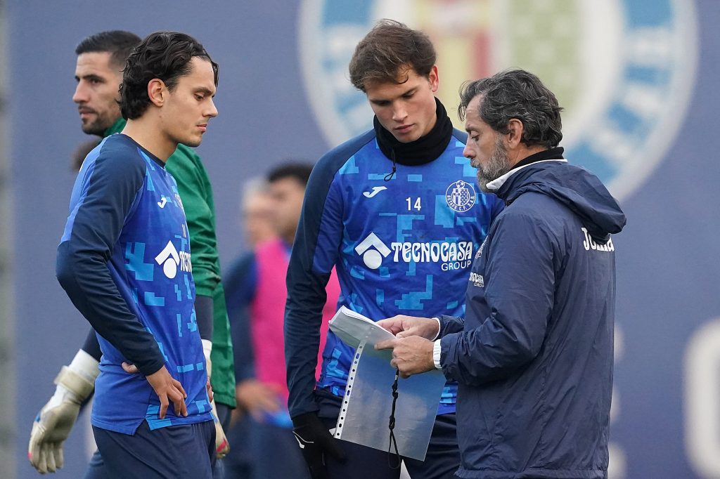 Quique da instrucciones a Unal y a Latasa durante un entrenamiento (foto: Getafe CF)