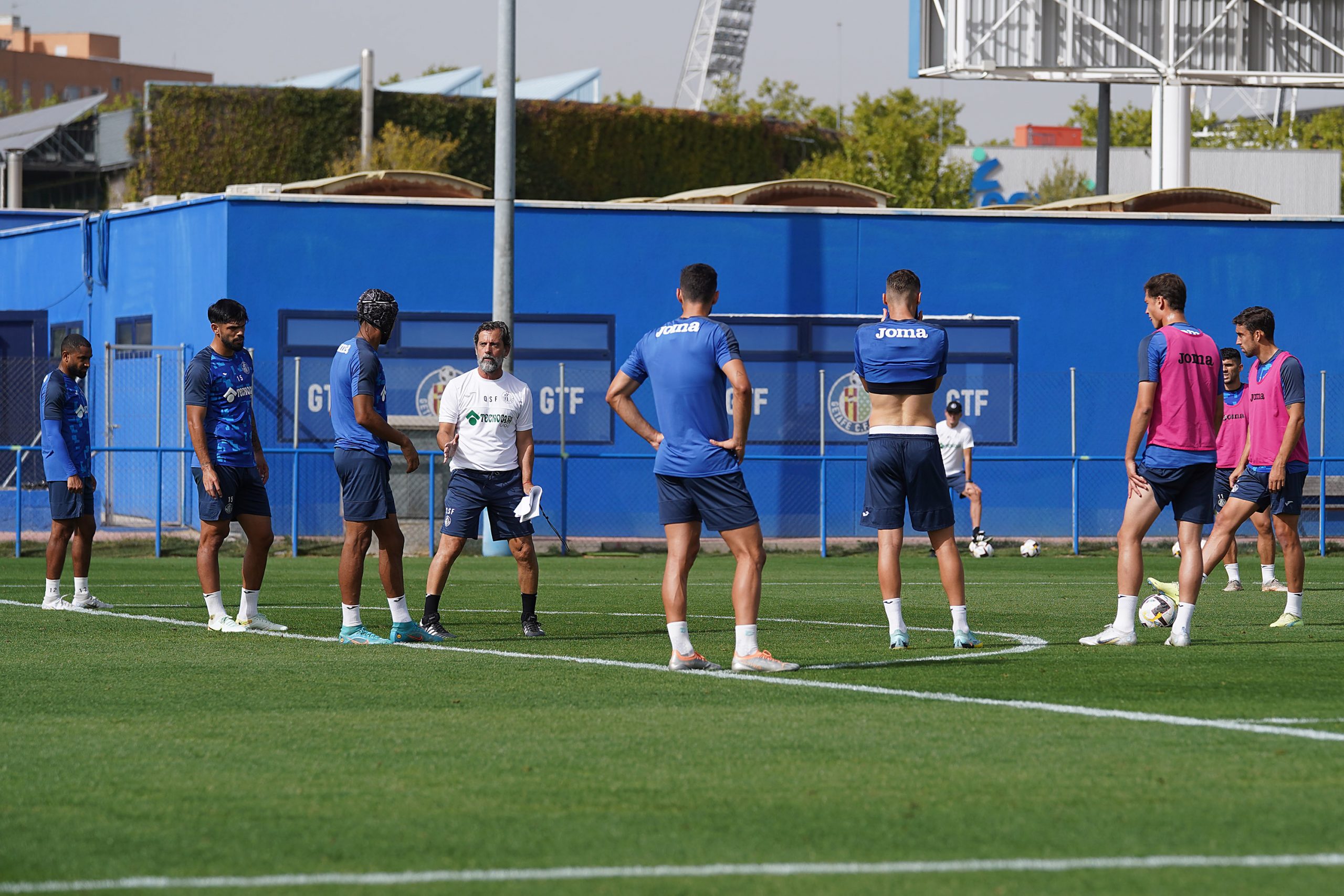Quique da instrucciones a los jugadores durante una sesión de entrenamiento (foto: Getafe CF)