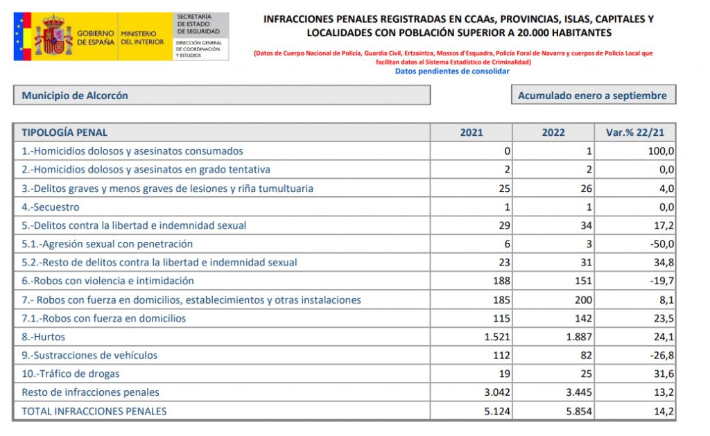 Así, según datos del Ministerio del Interior que dirige el socialista Fernando Grande-Marlaska, entre enero y septiembre subió la criminalidad en Alcorcón un 14,2% con respecto al mismo periodo de 2021. Es decir, que se cometen más infracciones penales que el año pasado.