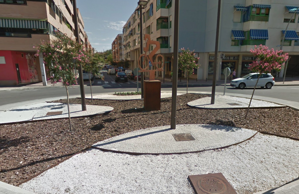 El monumento, que data del año 2014, se encuentra ubicado en la calle Cataluña, donde además de su simbología regula el tráfico después de que los vecinos de la zona demandaran su construcción para mejorar la seguridad vial. Así pues, un elemento útil para el tráfico y que además sirve de reconocimiento a la figura de Alberto Contador, el deportista más laureado y emblemático del municipio.