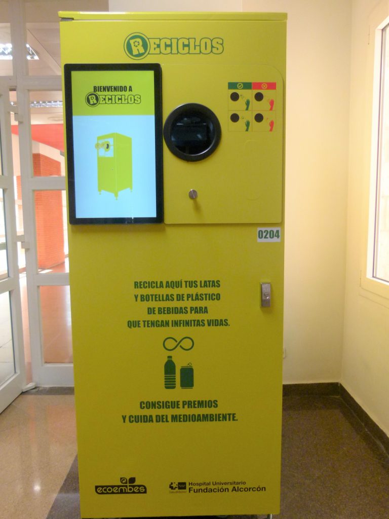 El Hospital Universitario Fundación Alcorcón ha incorporado recientemente tres máquinas RECICLOS, el Sistema de Devolución y Recompensa (SDR) de Ecoembes. Para hacer uso de estas máquinas, los ciudadanos solo tienen que descargarse la app gratuita RECICLOS, depositar todas sus latas y botellas de plástico de bebidas en ella y, al acabar, escanear el QR que mostrará la máquina.