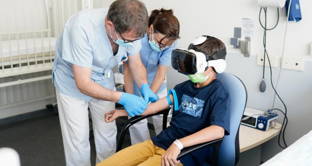 Para facilitar la estancia y la realización de pruebas clínicas a los menores, tanto ingresados como ambulatorios, el Servicio de Pediatría de este centro de la sanidad pública madrileña utiliza unas gafas virtuales que permiten al pequeño abstraerse de la práctica sanitaria mientras ve, escucha y disfruta de capítulos de dibujos animados, paisajes o situaciones que facilitan a los profesionales sanitarios la realización de muestras analíticas, electrocardiogramas, rayos u otras prácticas clínicas.