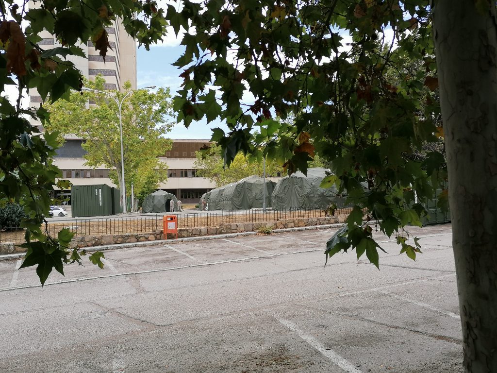 El Gómez Ulla fue uno de los centros hospitalarios que vio desbordadas sus capacidades en la primera ola de la pandemia y ahora, ante el aumento de casos en Madrid, ha decidido adelantarse ante un posible aumento de la infección. Las tiendas, ubicadas en su aparcamiento, son visibles desde la calle y llevan instaladas desde la pasada semana.