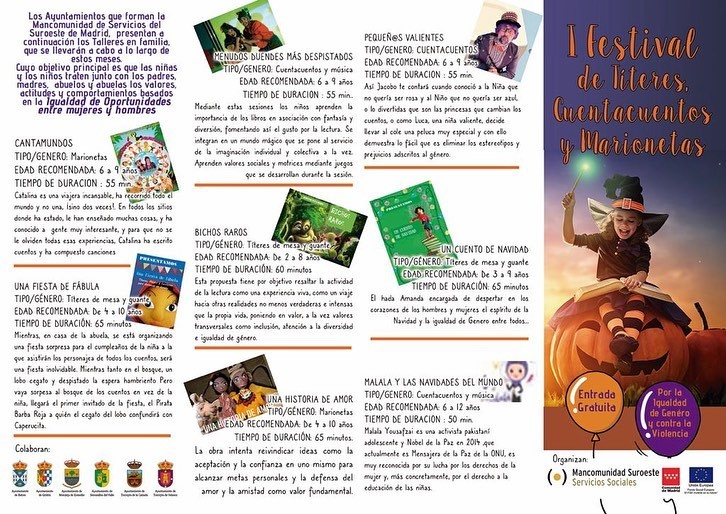 El turno de las marionetas llegará el viernes, 5 de noviembre, con ‘Una historia de amor’ a las 18.00 horas; mientras que para el cuentacuentos habrá que esperar hasta el 21 de diciembre, a las 12.00 horas, con ‘Malala y las Navidades del mundo’.