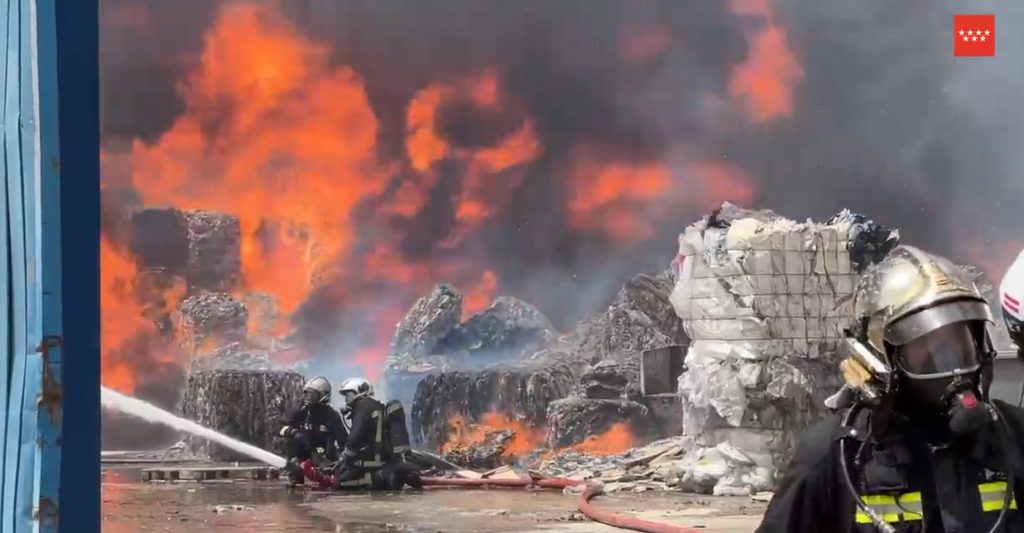 Doce dotaciones de Bomberos de la Comunidad de Madrid han trabajado en la extinción de un incendio sin heridos, registrado en una nave de reciclaje de residuos industriales ubicada en Serranillos del Valle.