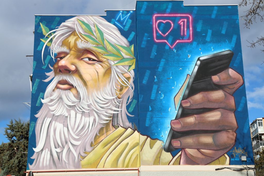 Este referente para las nuevas generaciones reflexiona en la obra propuesta, sobre el pasado y el presente ligado a la obsesión de esta sociedad por coleccionar likes, representada en una figura humana del mundo antiguo interactuando con su teléfono móvil.