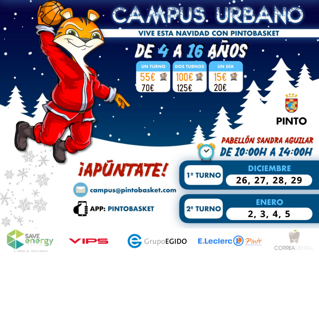 Según informan desde el club pinteño, este campus se celebrará en dos turnos. El primero será del 26 al 29 de diciembre, mientras el segundo tendrá lugar del 2 al 5 de enero. Las actividades se desarrollarán en los pabellones Sandra Aguilar y Parque Pinto en horario de 10 a 14 horas, si bien es posible ampliar esa franja.