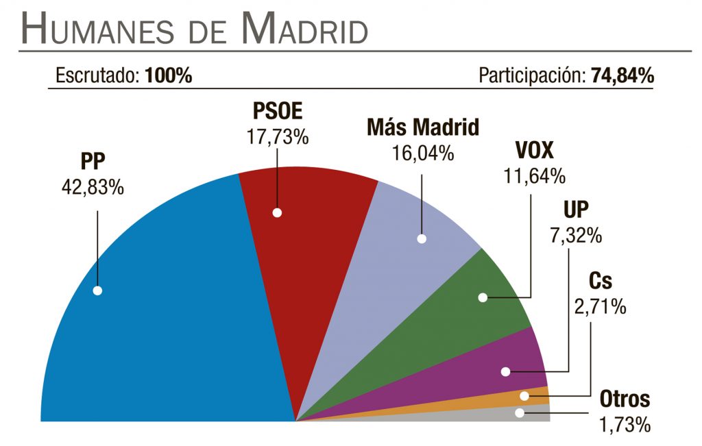 Apabullante victoria del Partido Popular en Humanes de Madrid. Con el 100% del voto escrutado, los populares han conseguido 4.077 votos este 4 de mayo, lo que significa un apoyo vecinal del 42,83% del electorado. Prácticamente triplican a la segunda fuerza, el PSOE, que se queda con 1.688 votos y un respaldo del 17,73% de los humanenses.