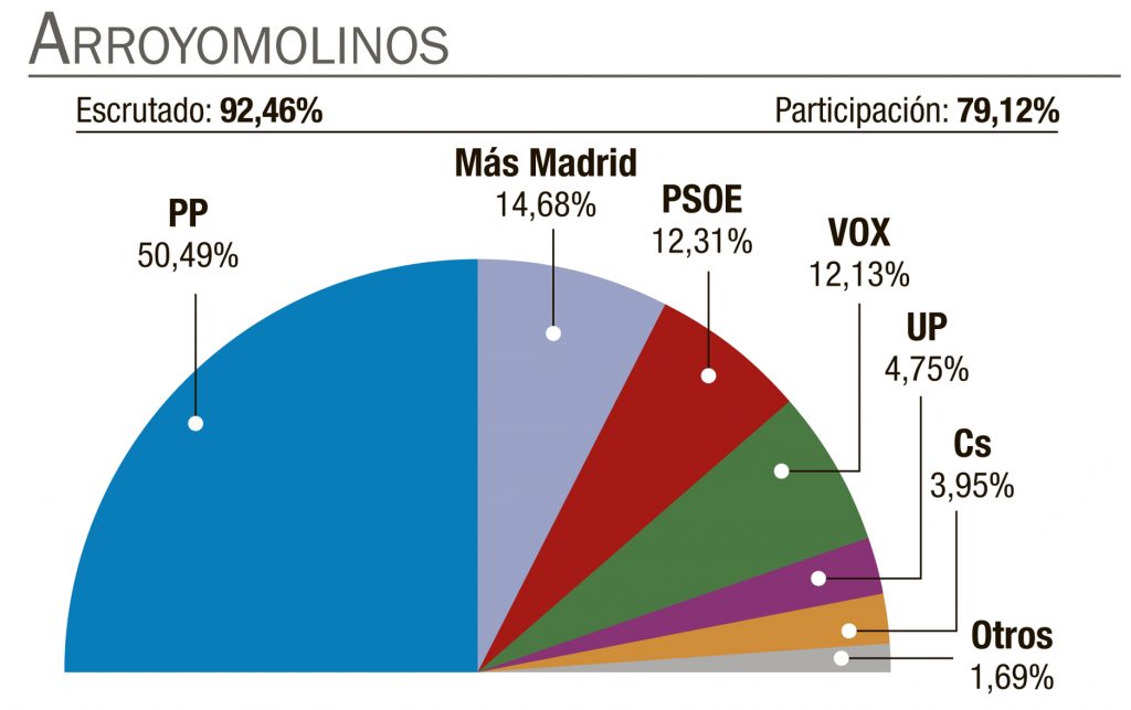 El Partido Popular manda en Arroyomolinos. La alcaldesa, Ana Millán, se había volcado personalmente en estas elecciones durante la campaña, siguiendo a Isabel Díaz Ayuso por toda la región. Y su trabajo parece haber dado sus frutos.