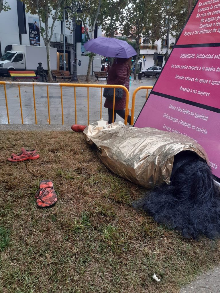La pasada semana, el Ayuntamiento de Getafe organizó una serie de actos con motivo del 25 de noviembre, Día Internacional contra la Violencia de Género. Entre ellos, una suerte de exposición que mostraba a un maniquí de mujer muerta en mitad de la calle y con el que se pretendía sensibilizar sobre esta lacra con una pirámide sobre las caras de la violencia.