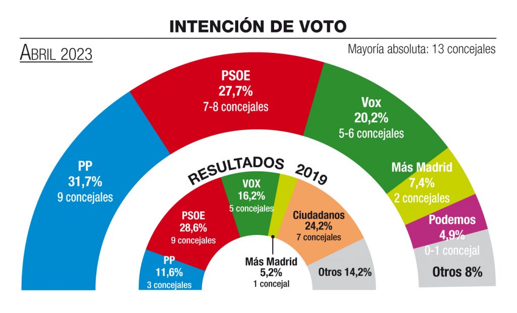 El sondeo, realizado entre el 19 y el 21 de abril sobre 502 entrevistas, refleja una subida importante de apoyos de los populares, que con el efecto Ayuso de por medio, triplican sus votos en cuatro años. Así, pasan de un porcentaje de voto del 11,6% cosechado en 2019 al 31,7% en 2023, que les darían hasta 9 concejales.