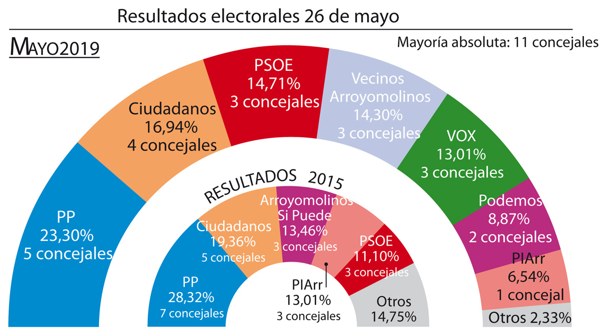 El Partido Popular de Ana Millán ha sido la fuerza más votada en Arroyomolinos, aunque ha perdido dos concejales respecto a los anteriores comicios municipales quedándose en 5 (23,02% de los votos emitidos). La nota más llamativa de estas elecciones en el municipio arroyomolinense ha sido la enorme fragmentación del voto, ya que hasta siete partidos cuentan con representación.
