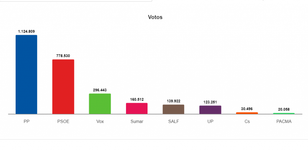 En Madrid, el Partido Popular ha sido el más votado. 1.124.809 electores han votado a la formación dirigida por Alberto Núñez Feijóo, 778.530 lo han hecho por el PSOE, 296.443 votaron a VOX, 160.512 a Sumar y 139.922 a la formación de Alvise.