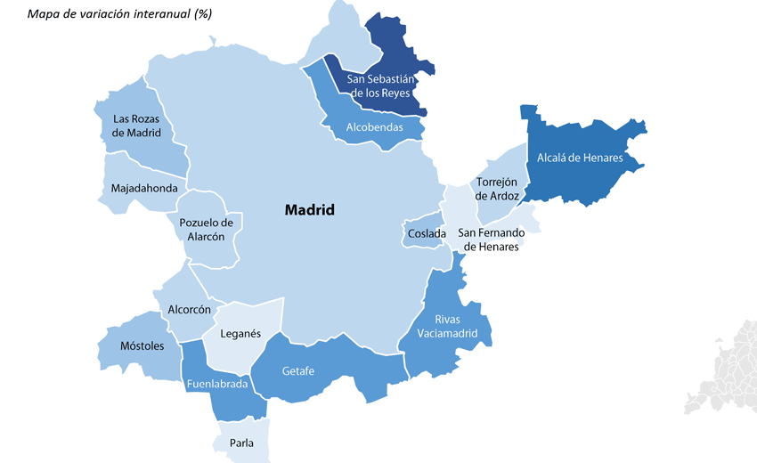 No obstante, hay localidades donde los precios no dejan de subir. Es el caso de San Sebastián de los Reyes, donde se incrementan en un 7%, Alcalá de Henares (6,1%) y Rivas Vaciamadrid (5,8%), que son las ciudades donde más crece el precio de la vivienda.