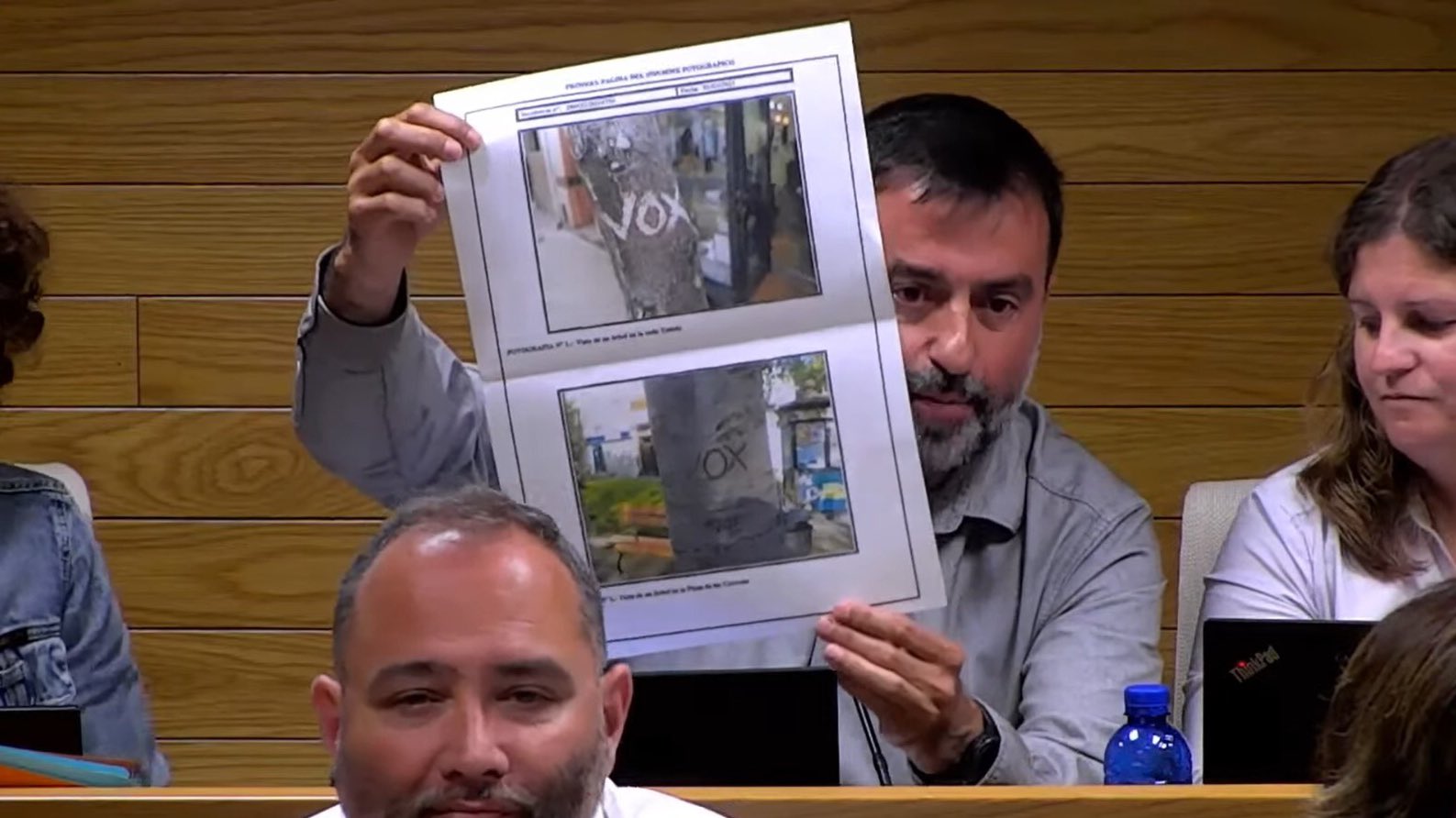 También el concejal de VOX, Ignacio Díaz Lanza, insistió en que «nosotros condenamos todos los actos vandálicos», y enseñando una fotografía de insultos al partido en grafitis en la ciudad, preguntó «si los socialcomunistas pueden decir lo mismo».