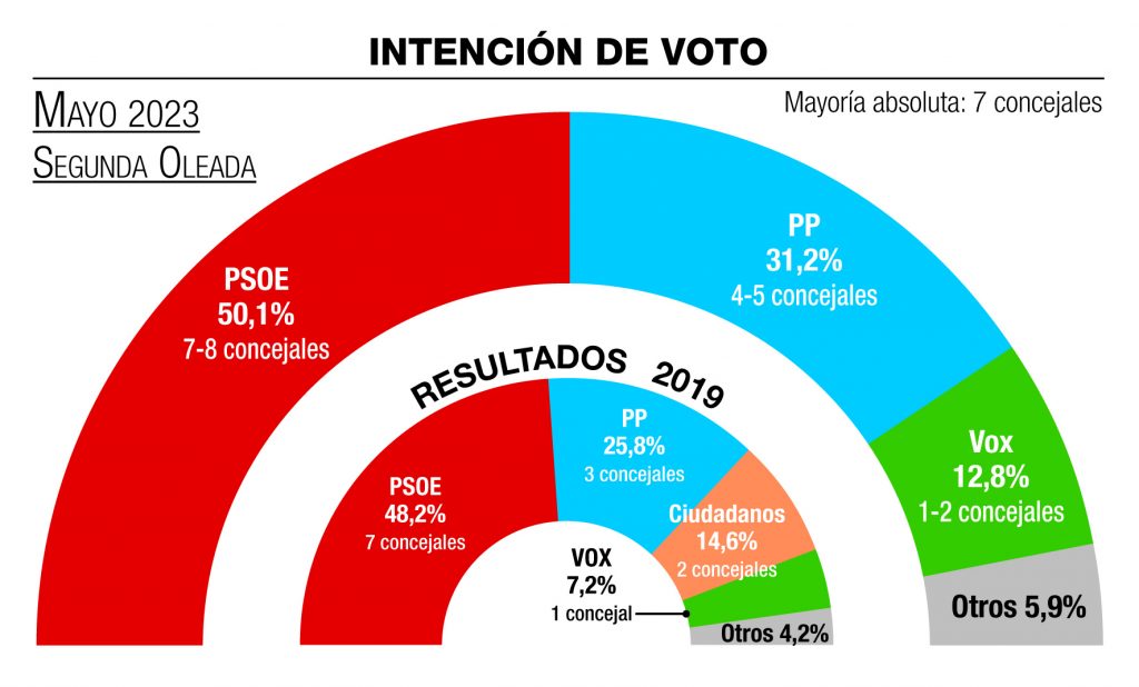 Así pues, el PSOE sería la fuerza más votada con un 50,1% de los votos y una horquilla de entre 7 y 8 concejales. Mayoría absoluta para la actual alcaldesa, que sumaría tres legislaturas con el bastón de mano. Los de Valle Luna conseguirían dos puntos más de respaldo que el cosechado en las urnas en 2019.