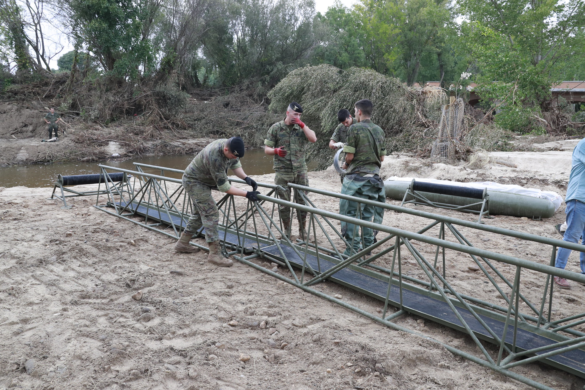 El puente provisional que están colocando los militares del Ministerio de Defensa para conectar las localidades de Aldea del Fresno y Villamanta, tras el derribo de varias infraestructuras en la primera localidad por las riadas ocasionadas por la DANA a principios de este mes, va «a buen ritmo» y estará acabado en unas semanas.