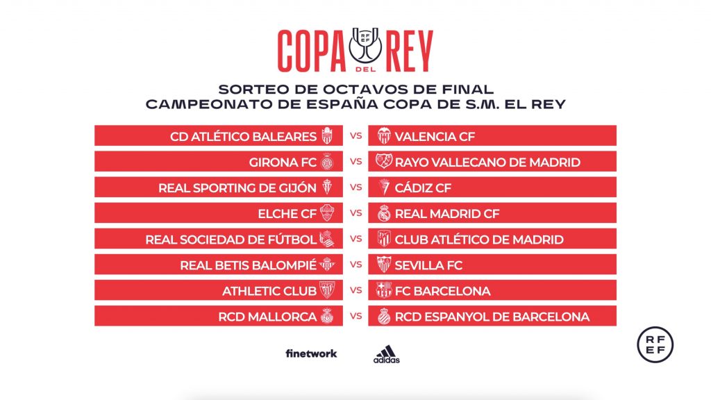 El Elche y la Real Sociedad serán los respectivos rivales del Real Madrid y el Atlético de Madrid en los octavos de final de la Copa del Rey, según ha deparado el sorteo celebrado este viernes en la Ciudad del Fútbol de Las Rozas. Otras de las eliminatorias más destacadas son Athletic de Bilbao-Barcelona y Betis-Sevilla.