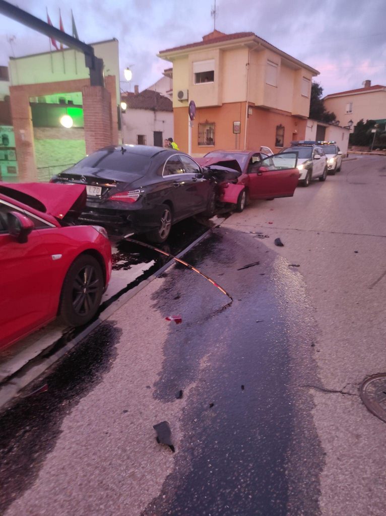 Una persecución policial terminó en accidente en Serranillos del Valle en la madrugada del sábado al domingo, 29 de octubre. Un vehículo, con cuatro ocupantes en su interior, llegó al municipio huyendo de la Guardia Civil y se estampó contra otros turismos estacionados en la plaza de España, cerca del Ayuntamiento.