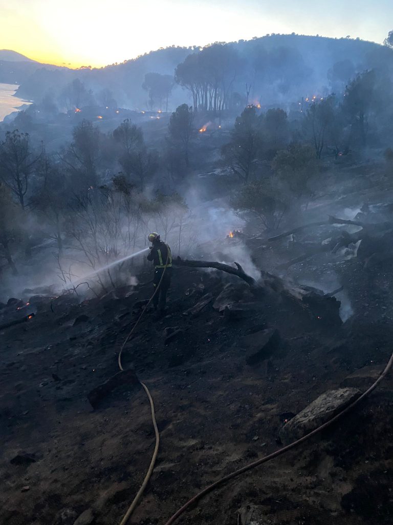 El incendio se originó a las 18.10 horas de esta tarde en la zona de la Playa de los nudistas, donde se desplegó un gran operativo de cinco helicópteros de la Comunidad y 18 dotaciones por tierra del cuerpo de bomberos de la región, brigadas forestales y la Guardia Civil.
