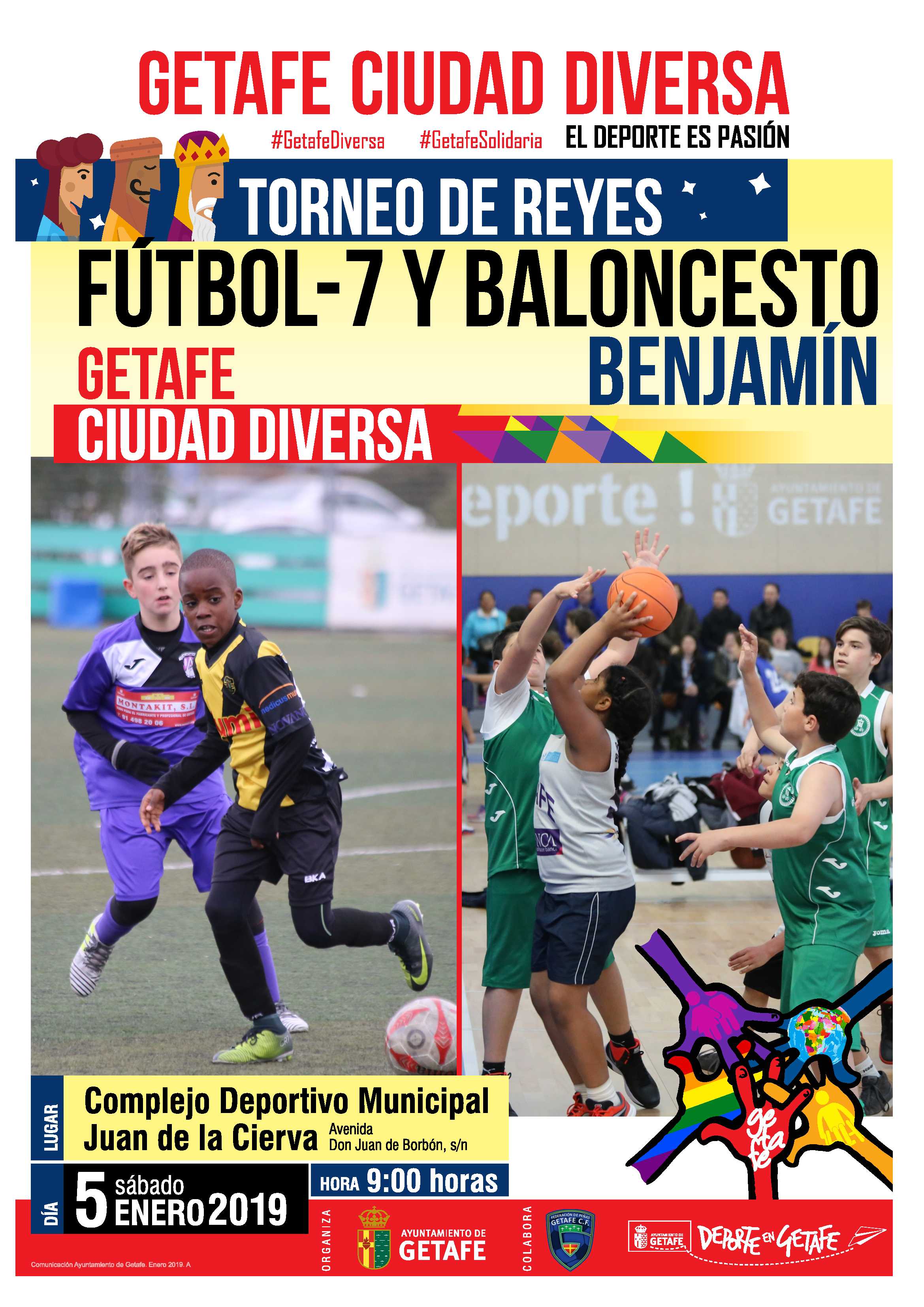 Este sábado de 9 a 14 horas se celebra el ‘Torneo de Reyes de fútbol 7 y baloncesto benjamín Getafe Ciudad Diversa’, que tendrá como escenario el complejo deportivo Juan de la Cierva y en el que participarán 300 niños y niñas. El fútbol se jugará en los campos de fútbol del complejo, mientras que el baloncesto se desarrollará en el pabellón Felipe Reyes.