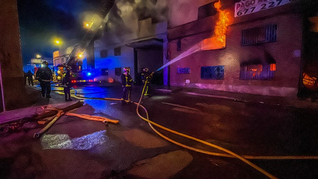 Bomberos de la Comunidad de Madrid y de Fuenlabrada han conseguido controlar esta madrugada el incendio declarado, sin que se hayan producido heridos, en una nave de palets ubicada en Fuenlabrada.