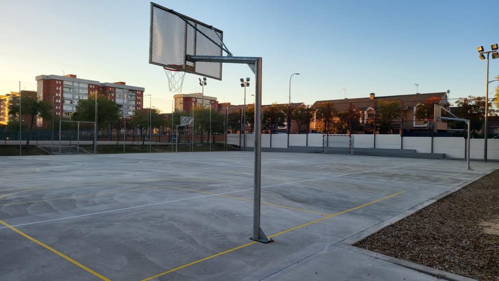 En la calle Portugal se reabre la pista polideportiva para practicar fútbol y baloncesto, tras unos trabajos de acondicionamiento en los que se ha procedido a reparar y pintar las canchas, además del cambio de las canastas, aros y porterías.