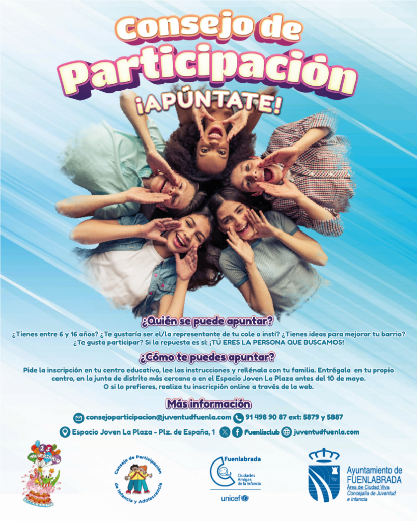 El Ayuntamiento de Fuenlabrada ha abierto el proceso de renovación del Consejo de Participación de Infancia y Adolescencia, el cual estará disponible hasta el 10 de mayo. Este órgano consultivo ha sido creado con el objetivo de dar voz y escuchar las propuestas de la población juvenil, comprendida entre los 6 y 16 años.