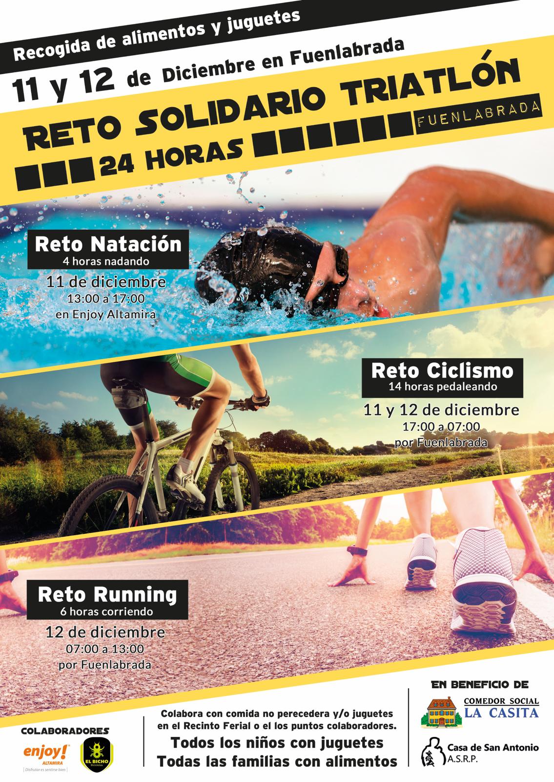 La Plataforma Reto Solidario 24 Horas Fuenlabrada anuncia un nuevo evento solidario que tendrá lugar entre los días 11 y 12 de diciembre. Si el pasado año el ciclista Iván David Vila completó 24 horas seguidas sobre su bicicleta con una espectacular respuesta de los vecinos, en esta ocasión la apuesta es por el triatlón y el desafío consistirá en completar 4 horas nadando, 14 horas pedaleando y las últimas 6 corriendo.