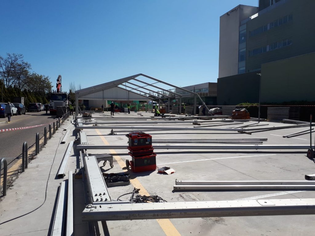 El Ayuntamiento de Fuenlabrada ha comenzado este jueves a instalar un hospital de campaña de 750 metros cuadrados que estará ubicado en el parking del Hospital Universitario de Fuenlabrada.