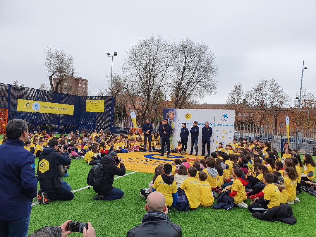 La inauguración del flamante recinto deportivo, que es el cuarto de este tipo que impulsan la Fundación Cruyff y la Caixa para promover el deporte como vía de inclusión y cohesión social, ha colapsado literalmente el centro educativo fuenlabreño, ya que a los cientos de niños presentes dentro y fuera de la cancha se han sumado numerosos medios de comunicación, así como profesores del colegio y diversas autoridades municipales encabezadas por el alcalde, Javier Ayala.