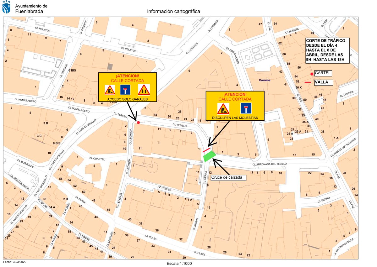 Los cortes se producirán durante todo el día en las cuatro jornadas por lo que el tráfico se desviará por la calle La Arena para los coches que vengan desde Humanes y por la calle Corralones para los que procedan de Leganés.