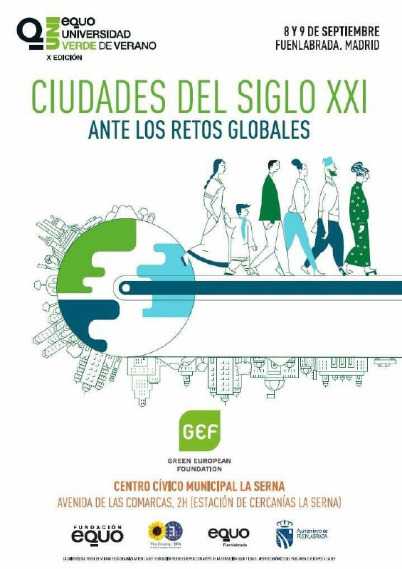 Ya está abierto el plazo de inscripción para la Universidad verde de Verano (‘Univerde’) de EQUO, que bajo el título ‘Ciudades del siglo XXI ante los retos globales’, se celebrará los próximos días 8 y 9 de septiembre y tendrá lugar en el Centro Cívico Municipal de La Serna, cedido por el Ayuntamiento de Fuenlabrada. Las inscripciones pueden realizarse hasta el próximo 4 de septiembre en la web Universidadverde.es