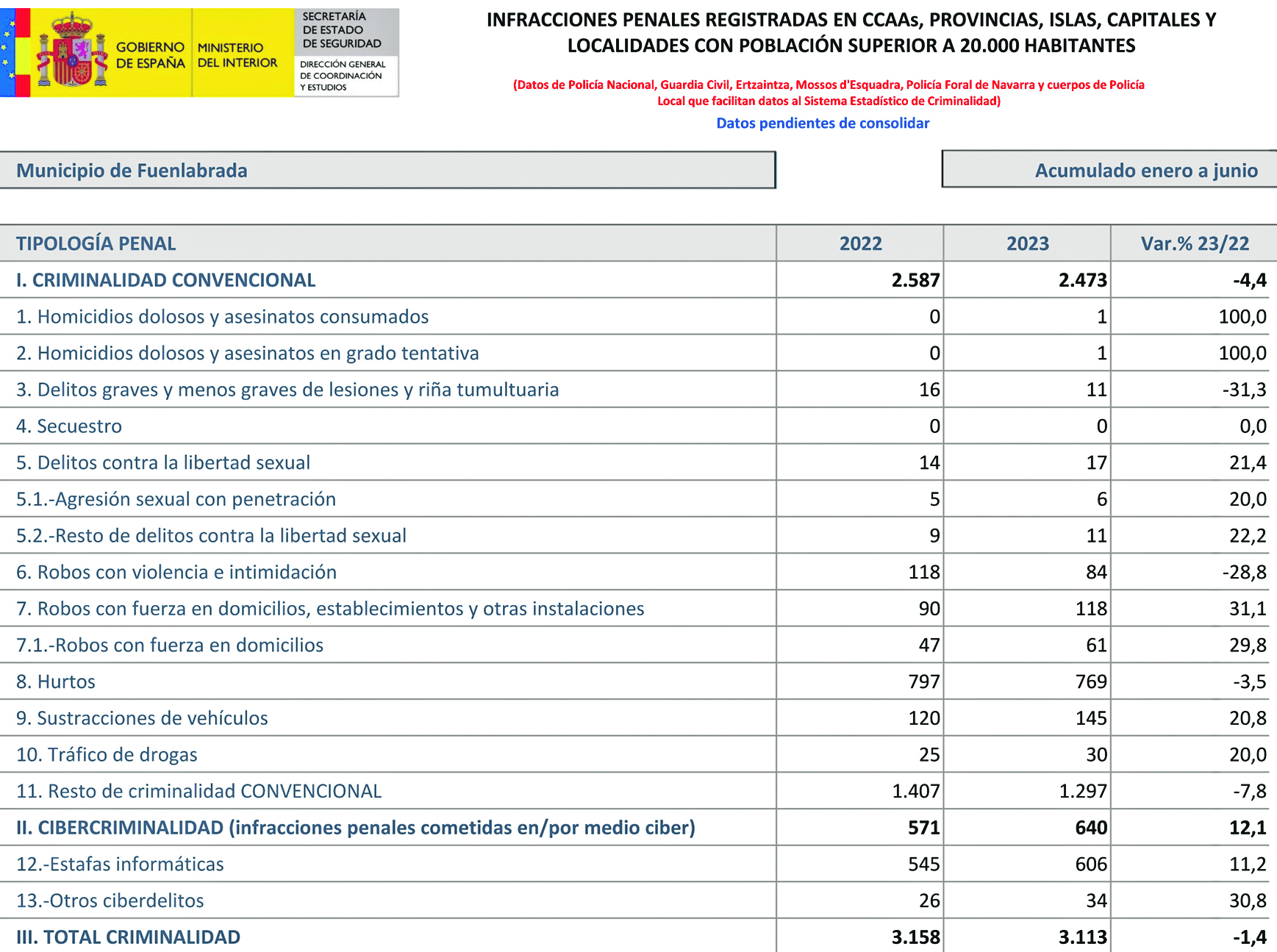 Fuenlabrada continúa arrojando datos positivos en la lucha contra la delincuencia, a tenor del segundo Balance de Criminalidad publicado por el Ministerio del Interior. Y es que, en el primer semestre de 2023, las infracciones penales se redujeron de media un 1,4% entre enero y junio de este año, con respecto al mismo periodo de 2022. Se cometieron 3.113 ilícitos frente a 3.158.