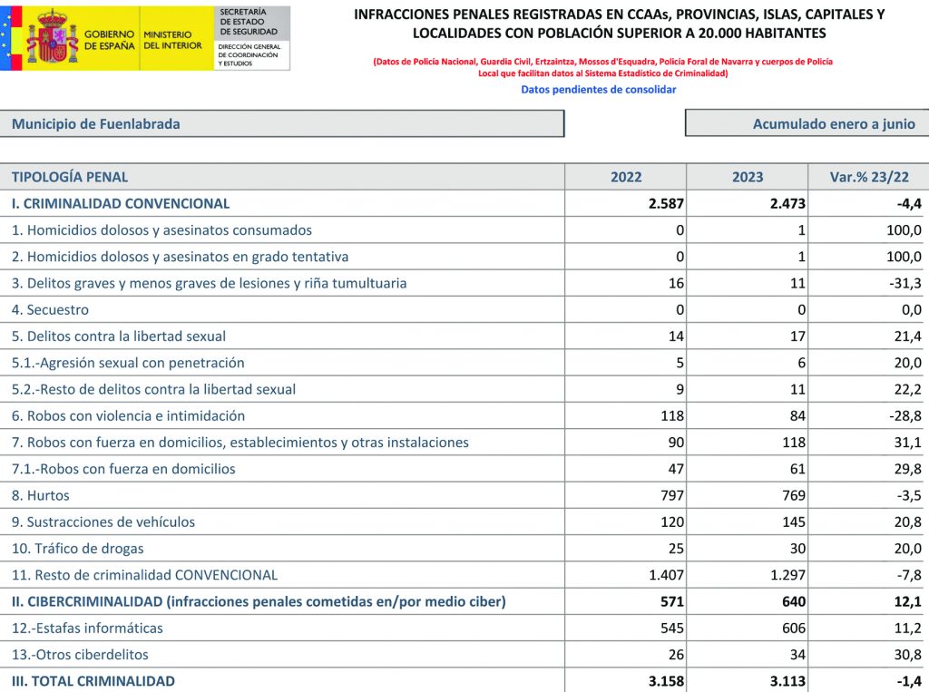Fuenlabrada continúa arrojando datos positivos en la lucha contra la delincuencia, a tenor del segundo Balance de Criminalidad publicado por el Ministerio del Interior. Y es que, en el primer semestre de 2023, las infracciones penales se redujeron de media un 1,4% entre enero y junio de este año, con respecto al mismo periodo de 2022. Se cometieron 3.113 ilícitos frente a 3.158.