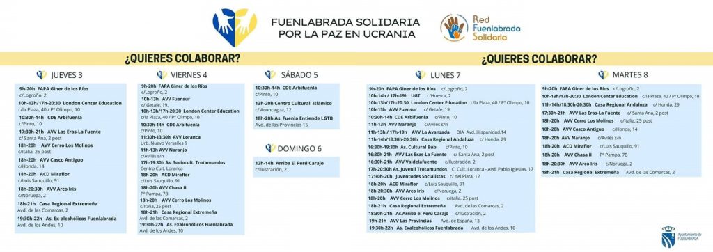 La Red Fuenlabrada Solidaria, que durante la pandemia de Covid-19 llegó a numerosas familias vulnerables, se ha reactivado esta semana con una campaña solidaria en favor de Ucrania, invadida por Rusia. Así se han habilitado un centenar de puntos para donar alimentos, ropa y material sanitario que se destinará a ese país.