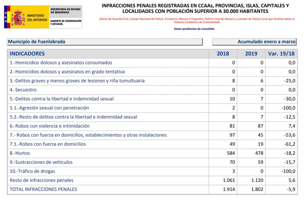 Las infracciones penales en Fuenlabrada se han reducido un 5,9% en el primer trimestre de 2019. Los datos del Balance de Criminalidad publicados por el Ministerio del Interior reflejan que en los tres primeros meses de este año ha habido 1.802 hechos punitivos frente a los 1.914 cometidos en el mismo periodo de 2018.