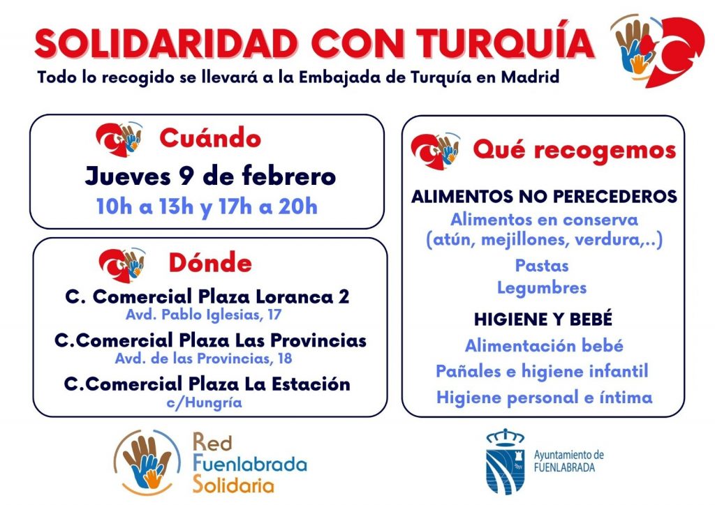 La Red Fuenlabrada Solidaria y el Ayuntamiento han iniciado una campaña de ‘Solidaridad con Turquía’, para recoger material y alimentos para los damnificados por el terremoto acaecido tanto en ese país como en Siria.