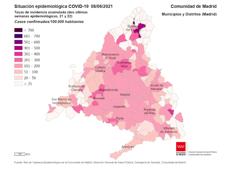 La Comunidad de Madrid ha actualizado este martes, 8 de junio, el balance epidemiológico sobre la incidencia acumulada (IA) de coronavirus en la región a 14 días, con significativos descensos en el sur de la región.