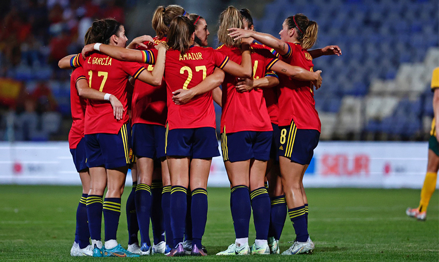 Varias jugadoras de la selección celebran un gol (foto: @SeFutbolFem)