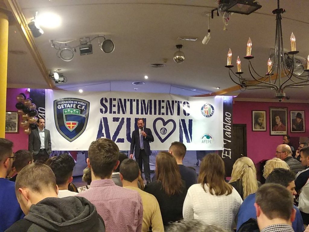 El acto organizado por la Federación de Peñas volvió a llenar de aficionados El Tablao, sede habitual de este acto durante los últimos años. En el transcurso del mismo se procedió a la entrega del ‘Premio al mejor jugador de la temporada 17-18′ a Djené y del ‘Premio Sentimiento Azulón’ al Ayuntamiento de Getafe, La alcaldesa, Sara Hernández, fue la encargada de recogar el galardón.
