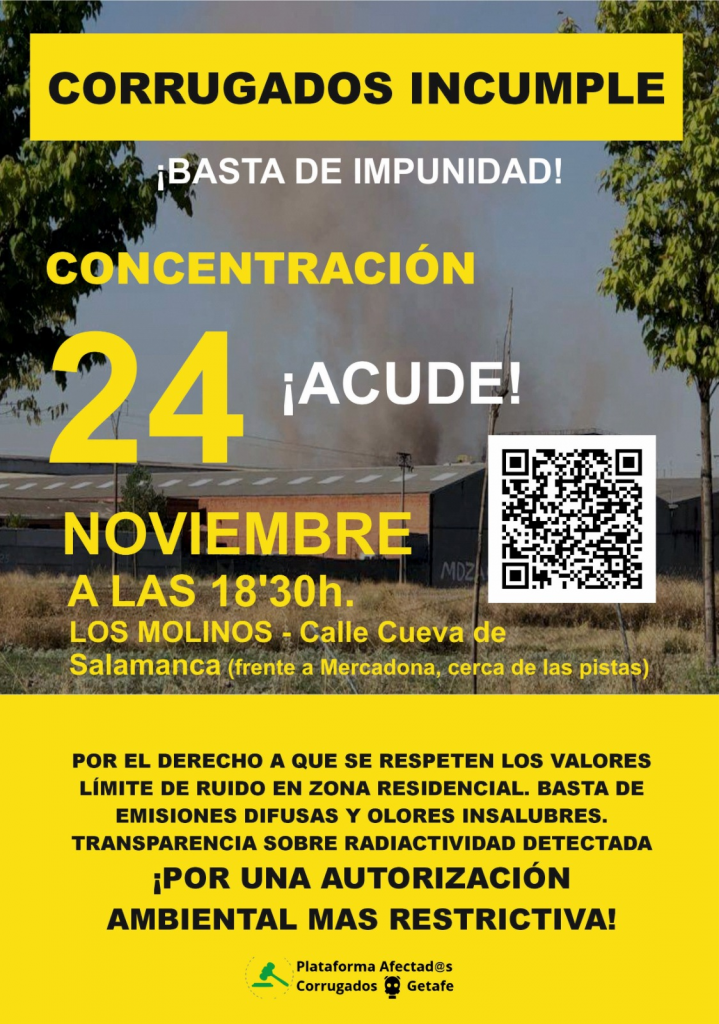 Vecinos de Los Molinos, en Getafe, se concentrarán el próximo viernes, 24 de noviembre, a partir de las 18:30 horas, a las puertas de Corrugados, convocados por la Plataforma de Afectad@s por Corrugados.