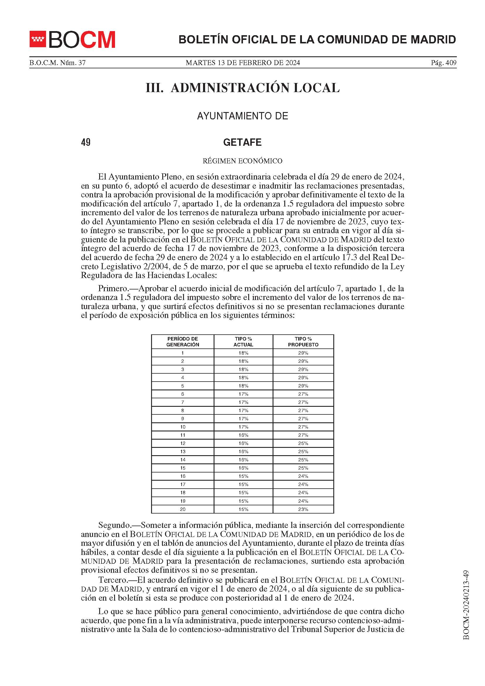 El Ayuntamiento de Getafe que preside Sara Hernández (PSOE) sube los impuestos a los getafenses, según los datos que recoge el Boletín Oficial de la Comunidad de Madrid (BOCM), publicado este martes 13 de febrero, que señala la aprobación del acuerdo inicial de modificación del artículo 7, apartado 1, de la ordenanza 1.5 reguladora del impuesto sobre el incremento del valor de los terrenos de naturaleza urbana, y que surtirá efectos definitivos si no se presentan reclamaciones durante el preceptivo período de exposición pública.