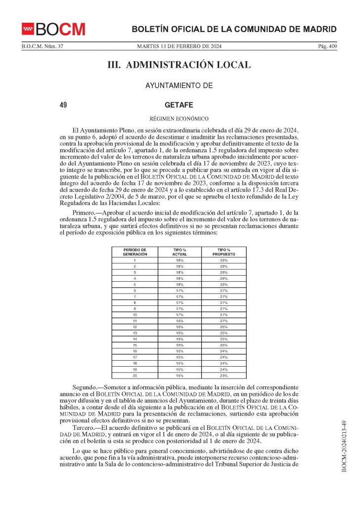 El Ayuntamiento de Getafe que preside Sara Hernández (PSOE) sube los impuestos a los getafenses, según los datos que recoge el Boletín Oficial de la Comunidad de Madrid (BOCM), publicado este martes 13 de febrero, que señala la aprobación del acuerdo inicial de modificación del artículo 7, apartado 1, de la ordenanza 1.5 reguladora del impuesto sobre el incremento del valor de los terrenos de naturaleza urbana, y que surtirá efectos definitivos si no se presentan reclamaciones durante el preceptivo período de exposición pública.