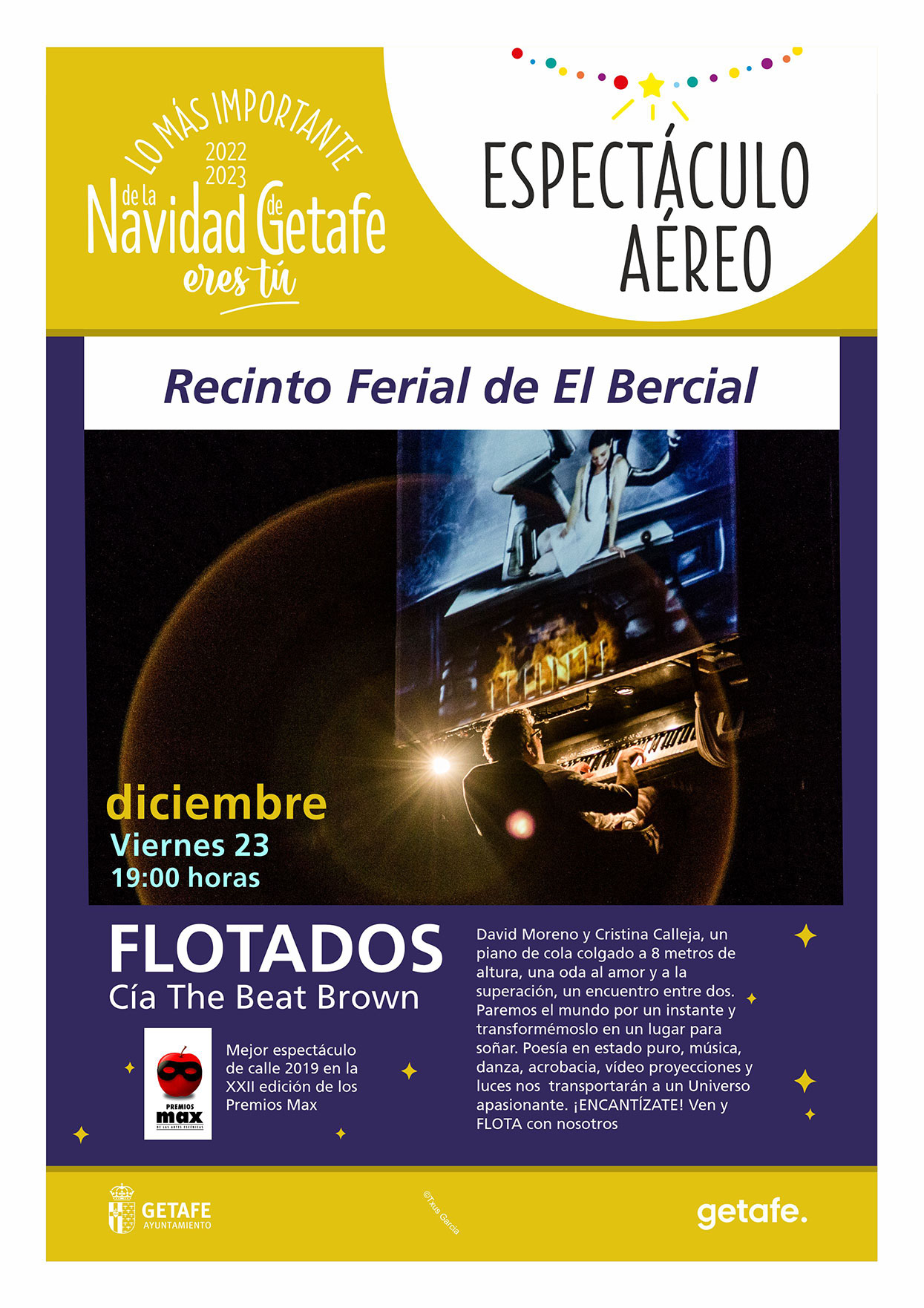En esta ocasión, David Moreno y Cristina Calleja regalarán al público getafense su particular oda al amor en un piano de cola colgado a ocho metros de altura. Por un segundo, ambos artistas pararán el tiempo para transformar el mundo que nos rodean.