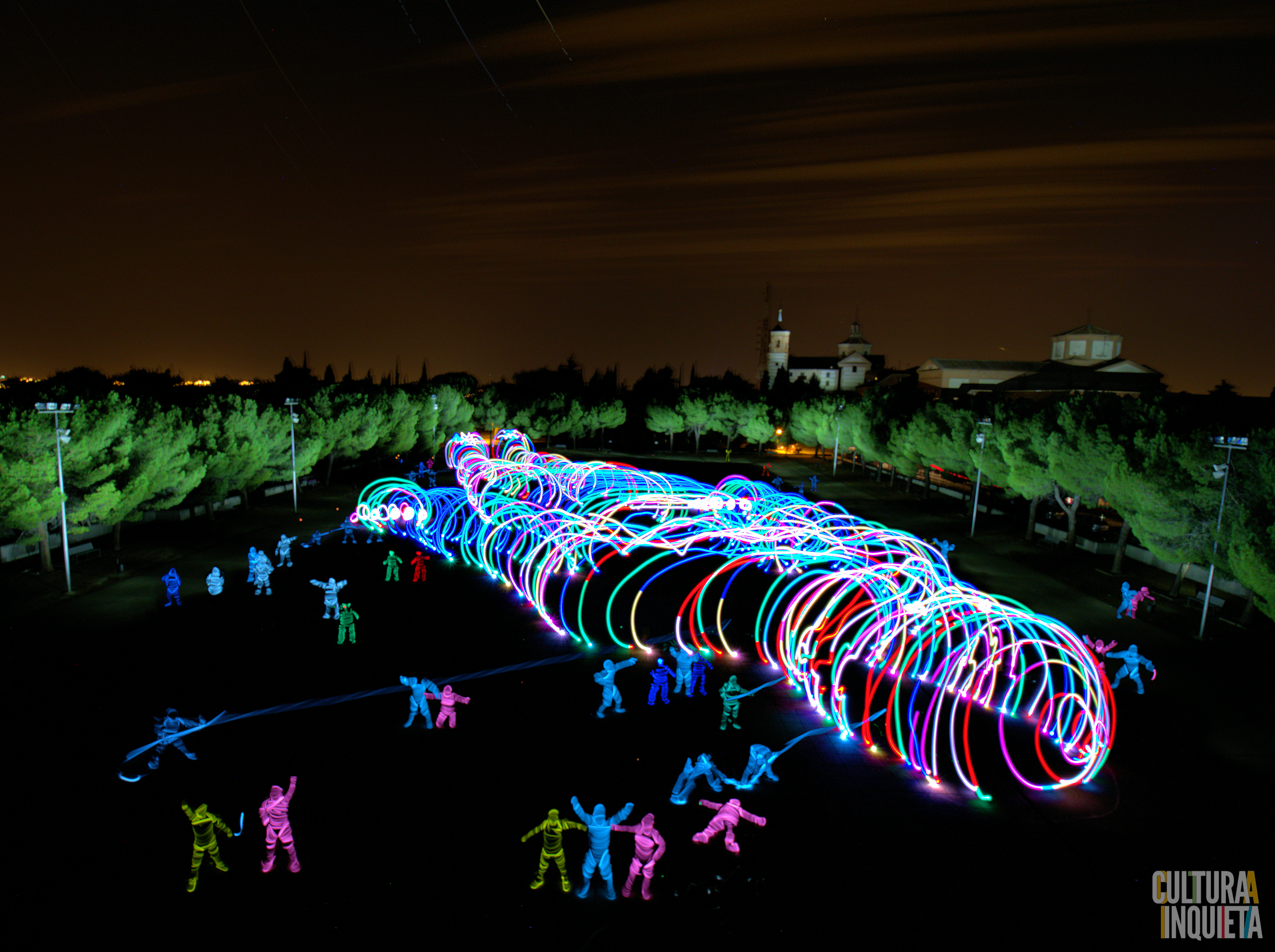 La asociación de fotógrafos de Getafe, Riders of Light, ha puesto el broche de oro así a la masterclass que ha realizado dentro del festival Cultura Inquieta. Gracias a utilizar la oscuridad como lienzo para pintar con luz se ha logrado que el diseño del artista Sfhir sea así de espectacular.